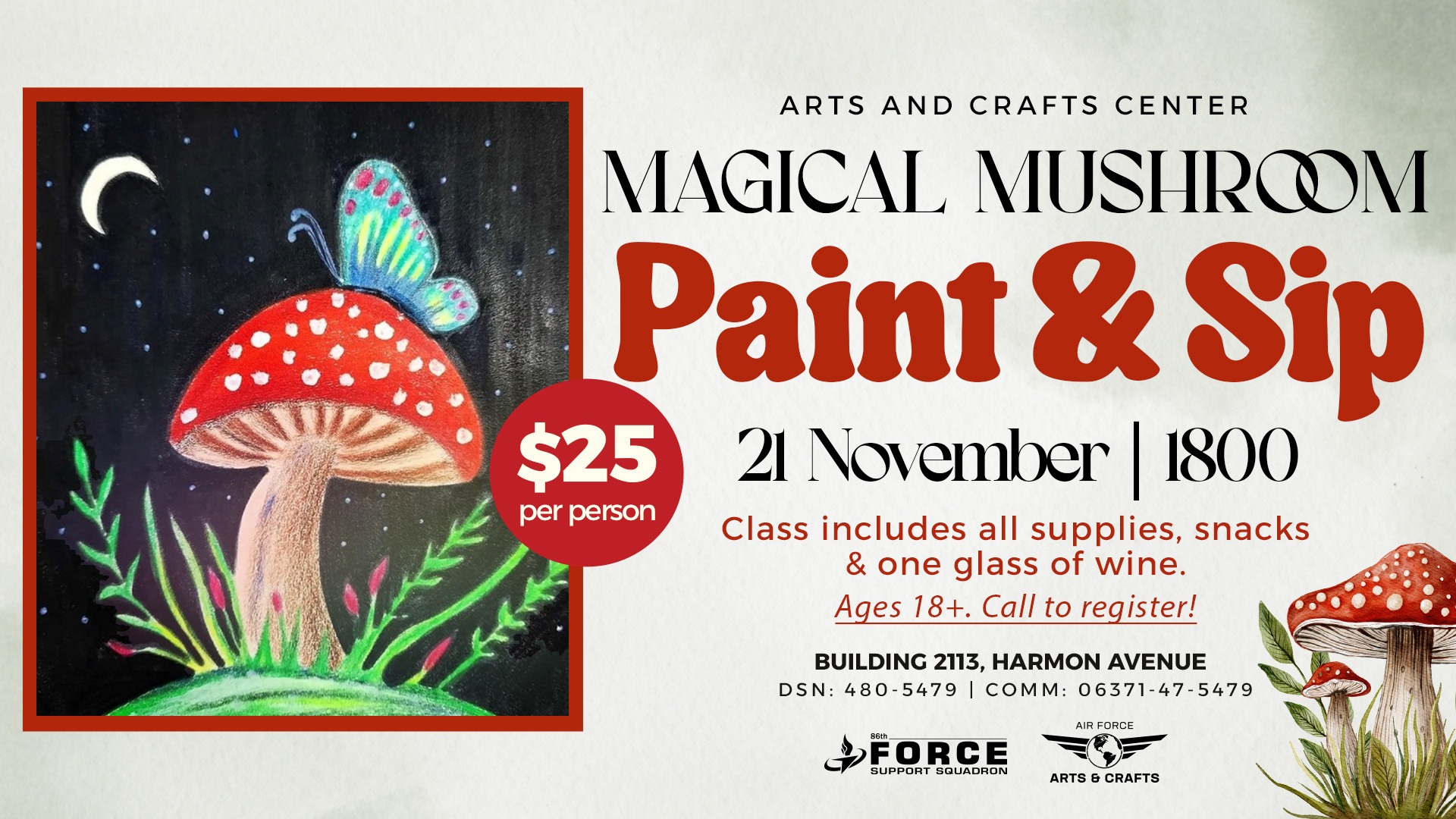 Step into a world of creativity and relaxation at the Magical Mushroom Paint & Sip hosted by the Ramstein Arts and Crafts Center on 21 November at 1800! This enchanting evening invites adults ages 18 and up to unwind, enjoy good company, and create a beautiful mushroom-themed painting inspired by the whimsical side of nature. […] ...