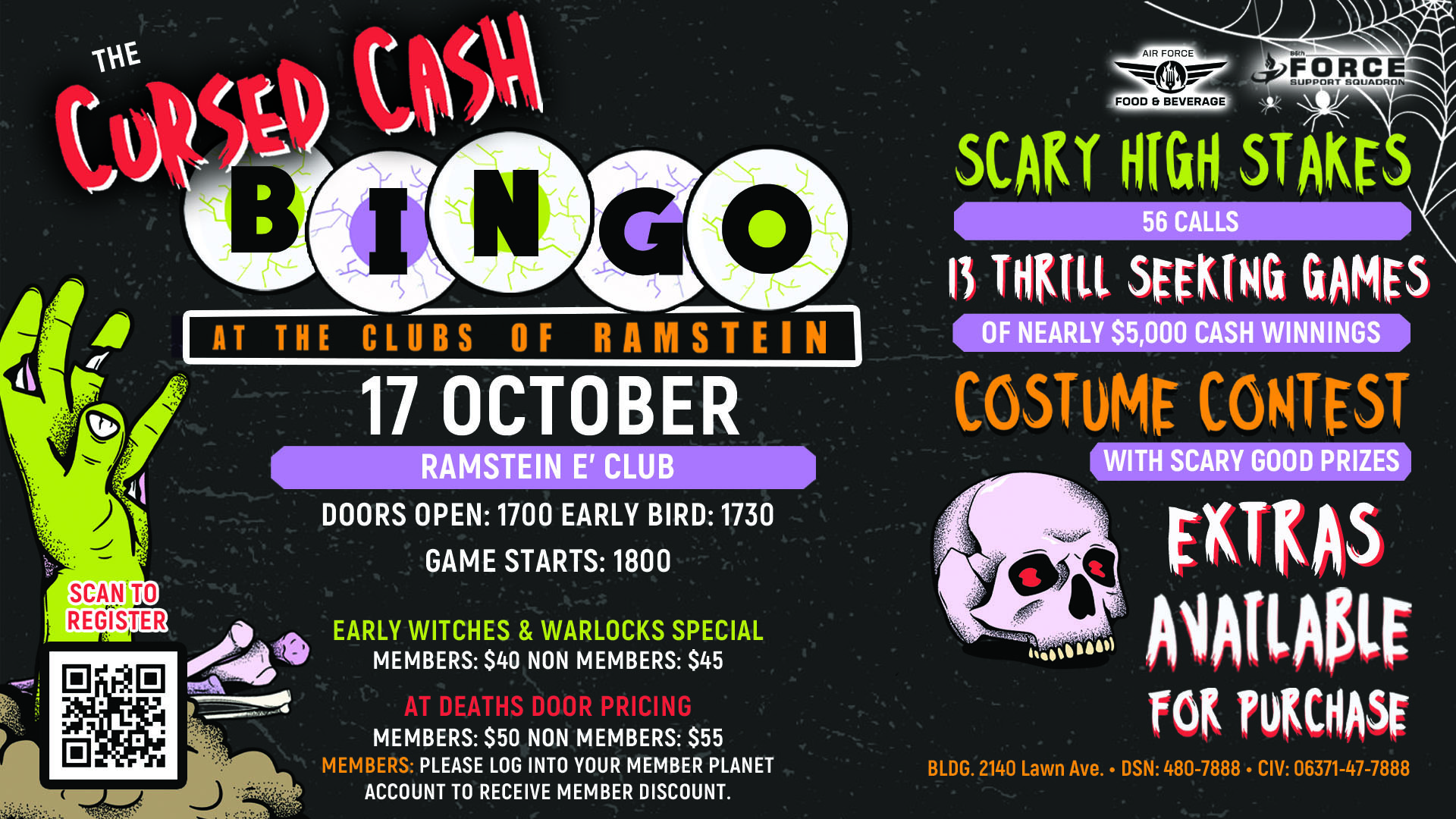 🎃 Dare to play… if you dare! Join us for Cursed Cash Bingo on 17 October at the Ramstein E’ Club. Doors creak open at 1700, Early Bird calls begin at 1730, and the main games rise at 1800. With 13 thrill-seeking games, 56 eerie calls, and nearly $5,000 in cash winnings, the stakes are […] ...