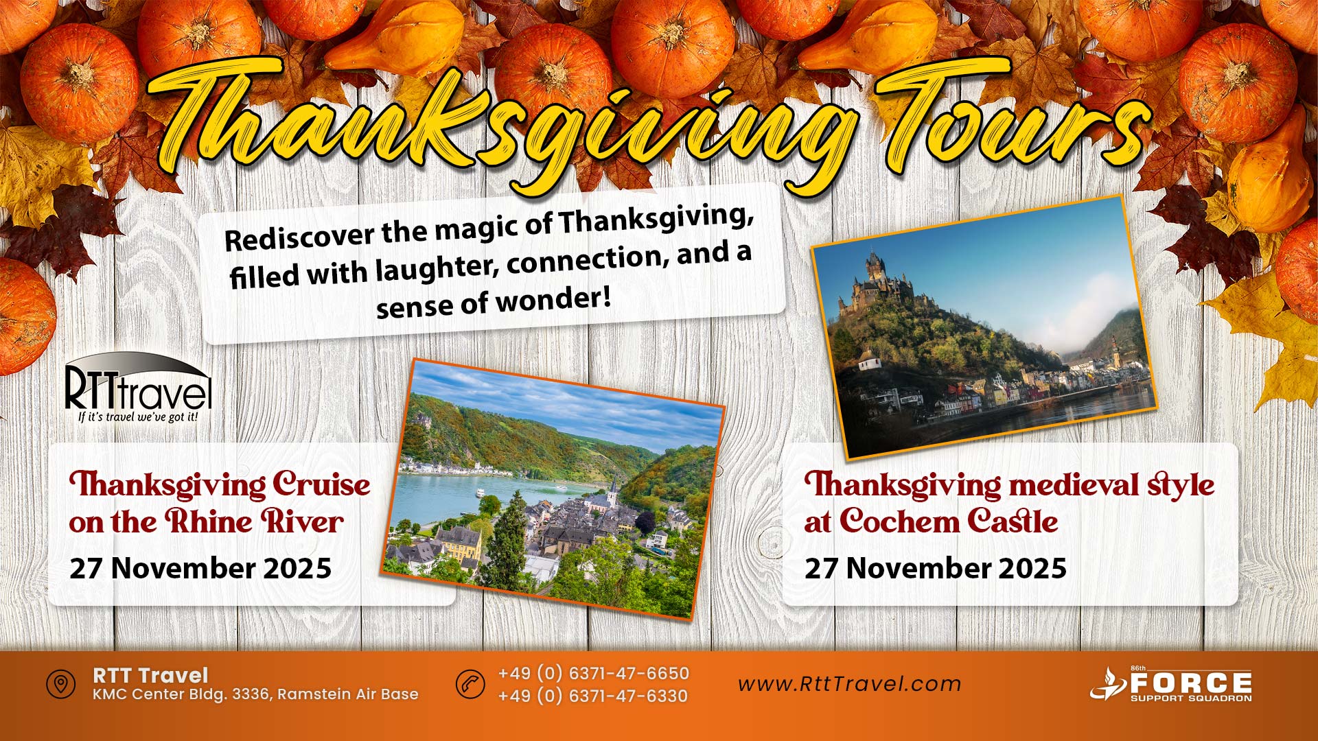 Celebrate Thanksgiving in unforgettable style with RTT Travel’s special holiday tours on 27 November 2025. Choose between a scenic Thanksgiving Cruise along the Rhine River or experience medieval magic with a feast at Cochem Castle. Both trips promise laughter, connection, and a sense of wonder as you enjoy the beauty of Germany during this special season. Rediscover the magic of Thanksgiving with RTT Travel at Ramstein Air Base.