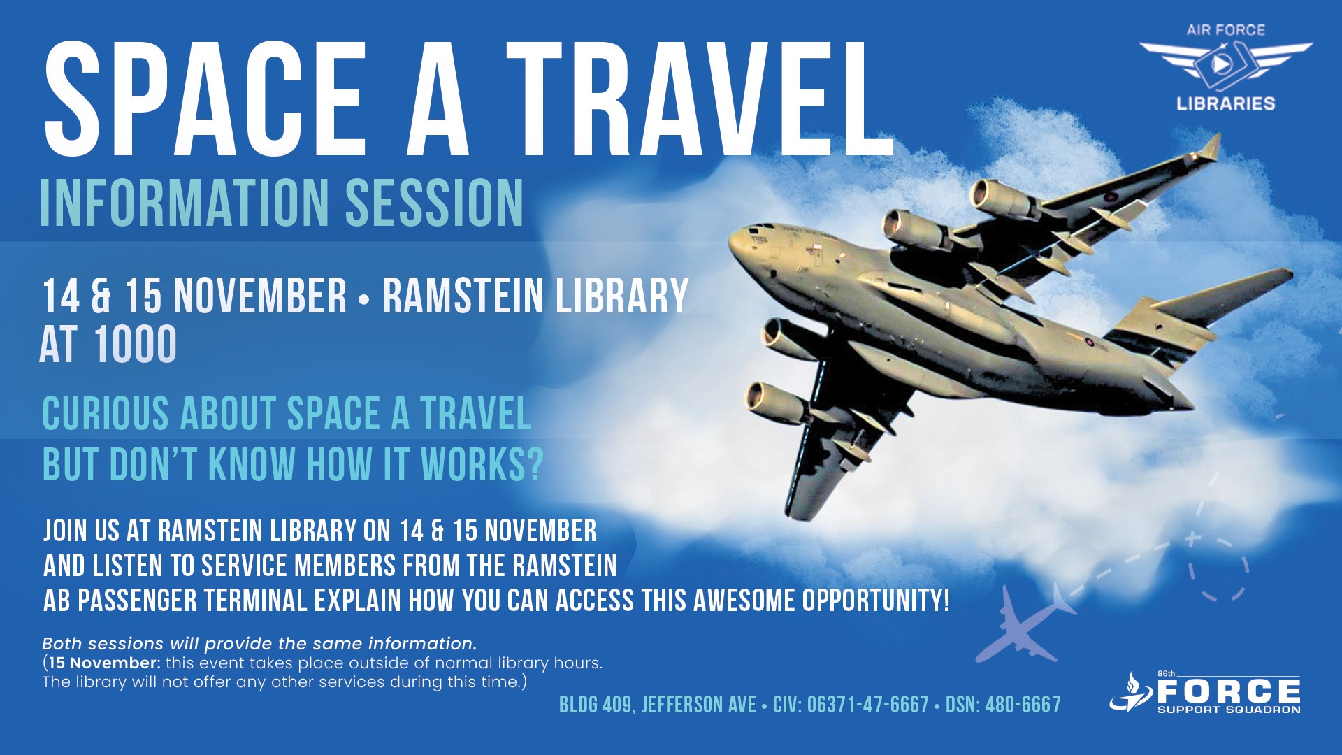 Join us at the Ramstein Library on 14 & 15 November at 1000 for an information session with service members from the Ramstein AB Passenger Terminal. Learn how Space A flights work and how you can take advantage of this awesome travel opportunity!