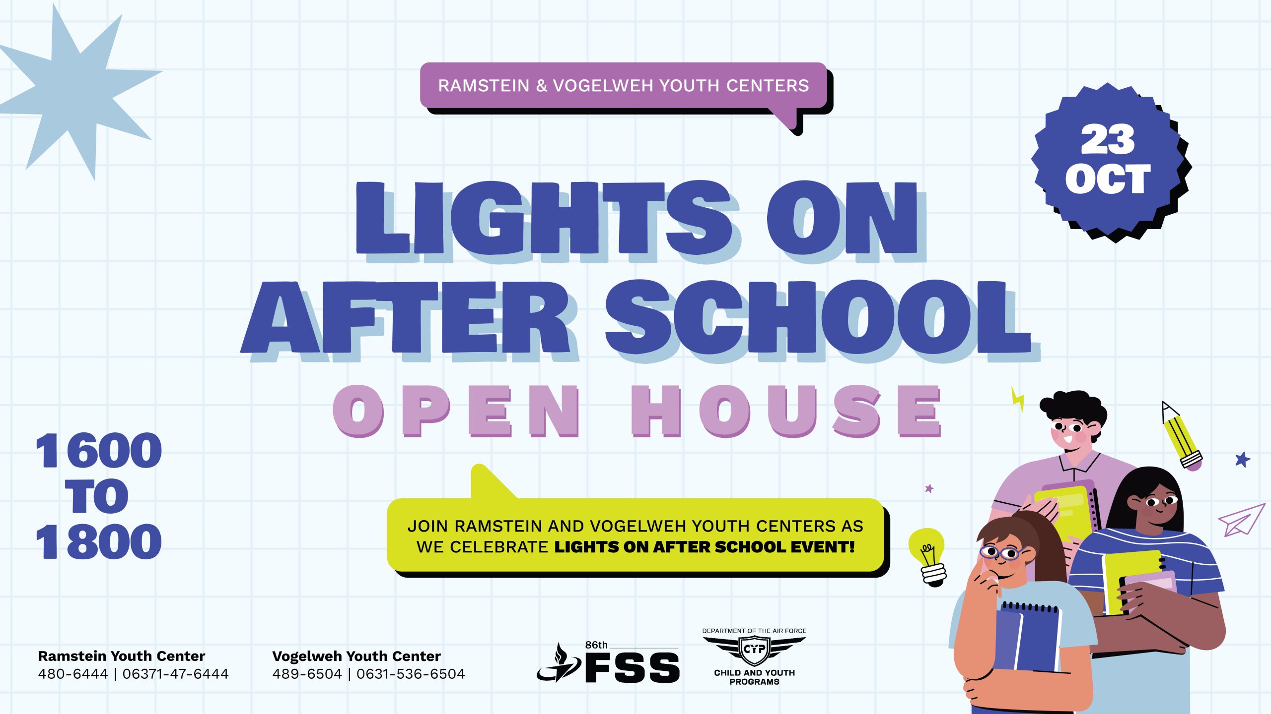 Keep the lights shining bright after school at our Lights On After School Open House on 23 October from 1600–1800 at the Ramstein and Vogelweh Youth Centers! 🎉 Come explore all the amazing programs we offer, meet the staff, and see how after-school activities spark creativity, learning, and fun for our youth. This celebration is all about connection, community, […] ...