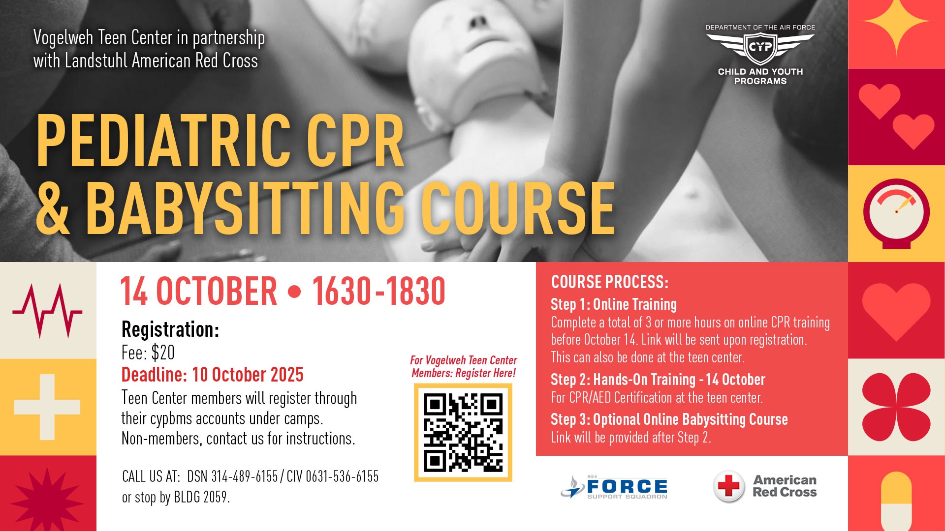 🩺👶 Learn to Save Lives & Build Skills!The Vogelweh Teen Center, in partnership with the Landstuhl American Red Cross, is hosting a Pediatric CPR & Babysitting Course on 14 October from 1630–1830. For just $20, participants will gain life-saving skills with CPR/AED certification and have the option to complete an online babysitting course. Registration closes […] ...
