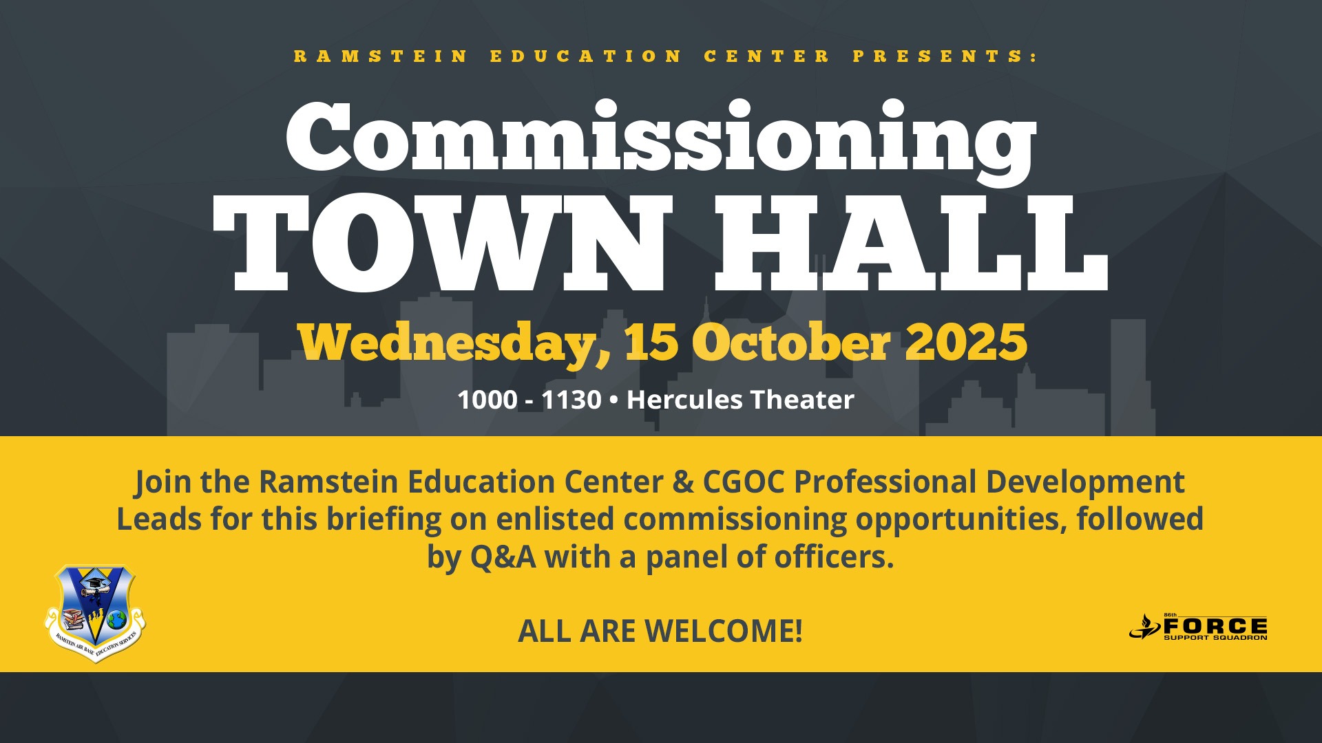Looking to take the next step in your Air Force career? Join the Ramstein Education Center and CGOC Professional Development Leads for a Commissioning Town Hall on Wednesday, 15 October 2025, from 1000 – 1130 at the Hercules Theater. This informative session will cover enlisted commissioning opportunities and wrap up with a Q&A panel of officers ready to share their […] ...