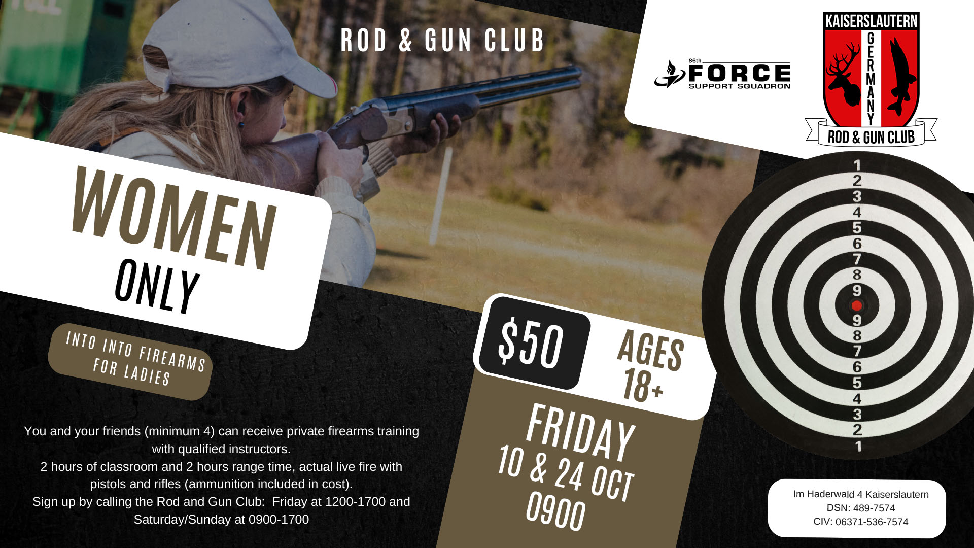 🎯 Ladies, It’s Your Turn to Take Aim!Join the Kaiserslautern Rod & Gun Club for a women-only introduction to firearms class on Friday, 10 & 24 October at 0900. Learn firearm safety, handling, and marksmanship with qualified instructors in a supportive, confidence-building environment. This private session includes 2 hours of classroom instruction and 2 hours […] ...