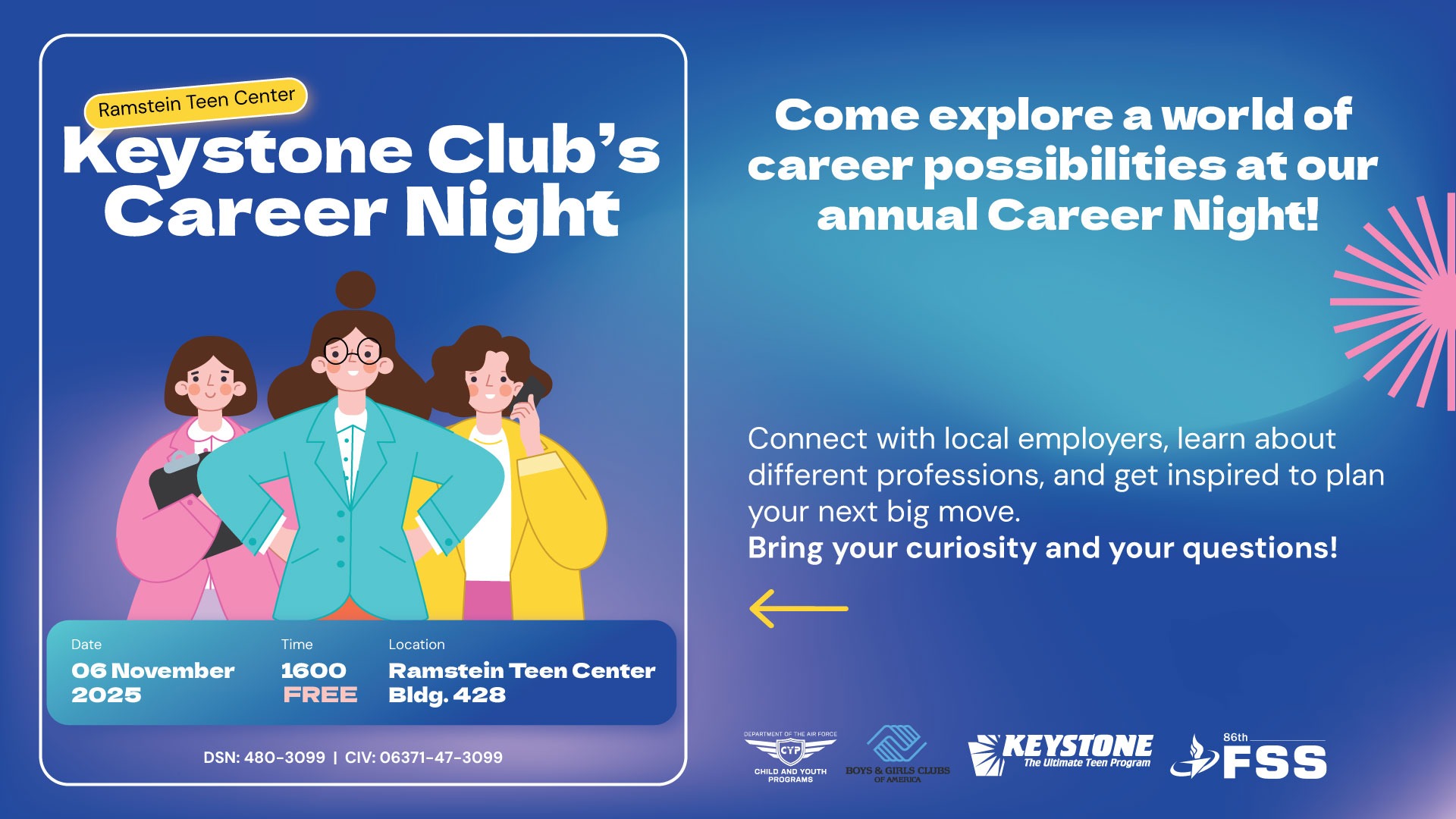 Get ready to explore your future at the Keystone Club’s Career Night hosted by the Ramstein Teen Center on 6 November 2025 at 1600! This free and inspiring event gives teens the opportunity to connect directly with professionals from a wide range of career fields and industries. Whether you already have a dream job in […] ...